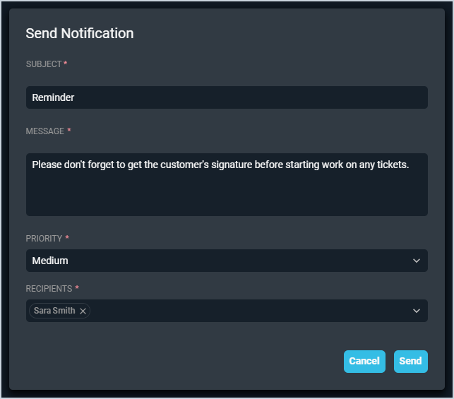 | 5 | Cancel/Send | Click to cancel or send the notification with the information entered. |