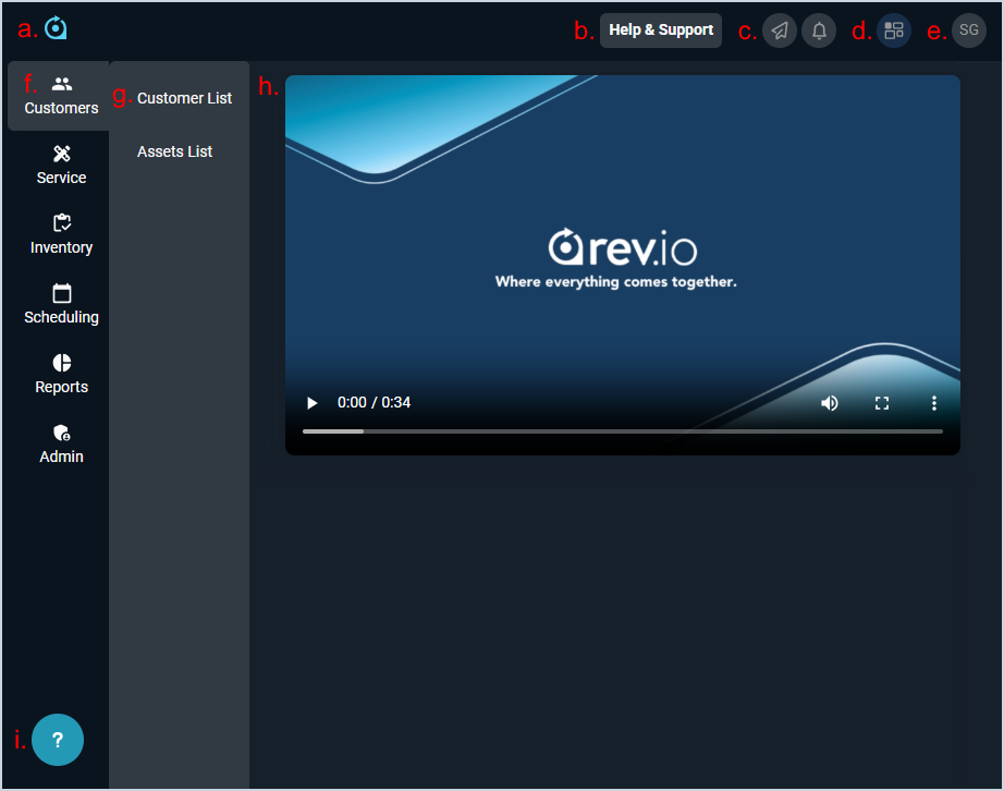 | h. | Main View | Main area of interaction in the Rev.io PSA environment. For information on specific screens, see the help articles related to the content topic. |