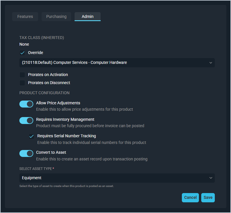 | 9 | Convert to Asset | Click to automatically create an asset for the customer when a transaction containing the product is posted.