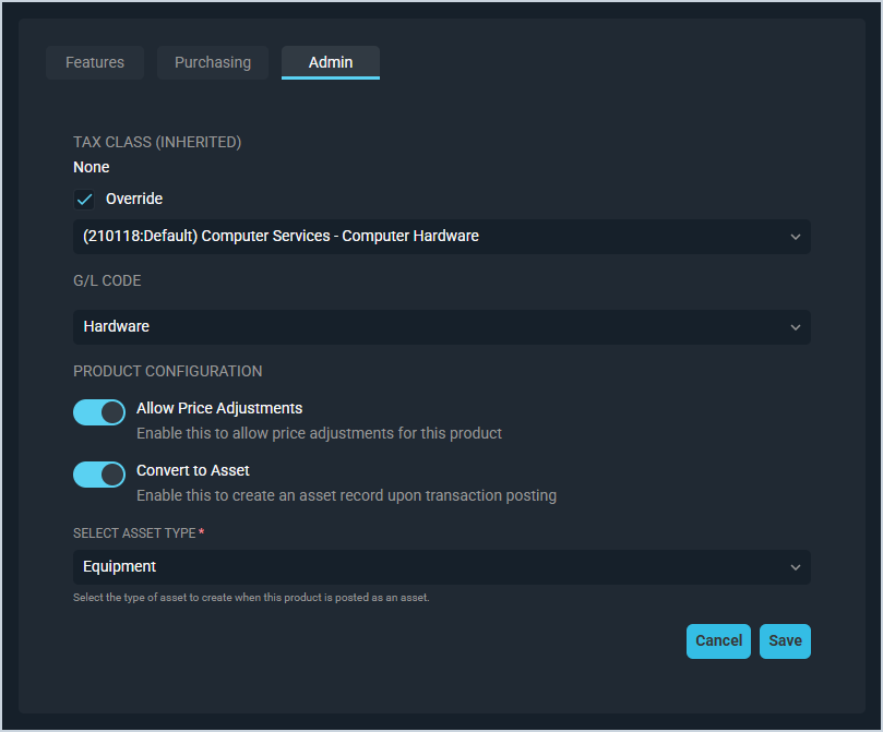 | 6 | Select Asset Type | Select the type of asset to create on the customer account when a transaction with this product is posted. This field only displays if Convert to Asset is enabled. |