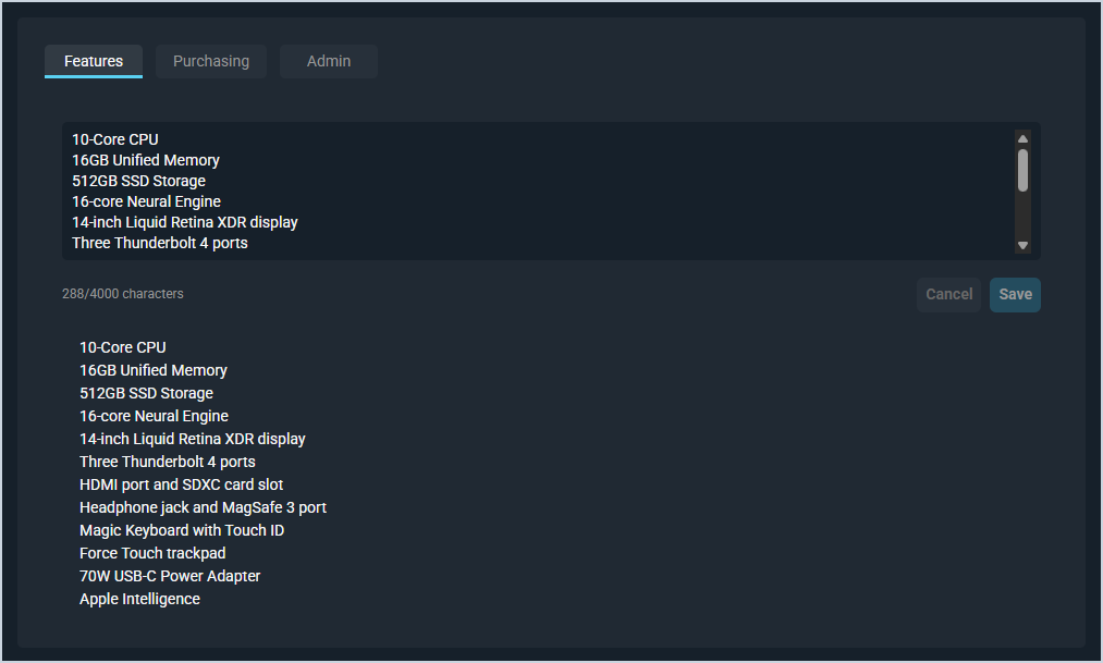 The Features tab on the Product Details screen allows you to enter various details, specifications, and notes about the product. To modify the features list, simply type directly in the text box. Then, click the Save button to save your changes. The text you entered displays in full beneath the text box, and any changes made in the text box will update the list once you click the Save button.