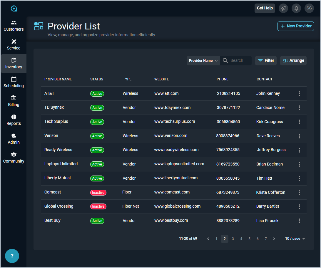 The Providers list view displays every provider in your database, though Inactive providers are hidden by default. A 'provider' in PSA is any entity you interact with for the products or services provided by your company, including physical goods, labor, services, licenses, etc. Providers can include, but are not limited to, vendors, provisioners, contractors, subcontractors, etc.