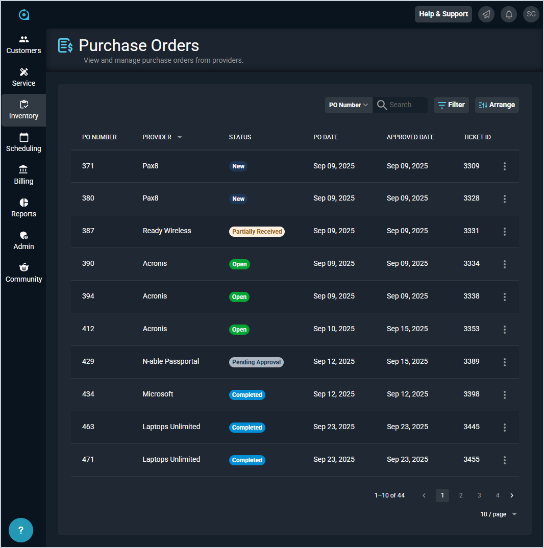 - View more details for the purchase order by clicking the row or the ellipsis at the end of the row and selecting View from the menu. See the View Purchase Order: Details article for more information.
