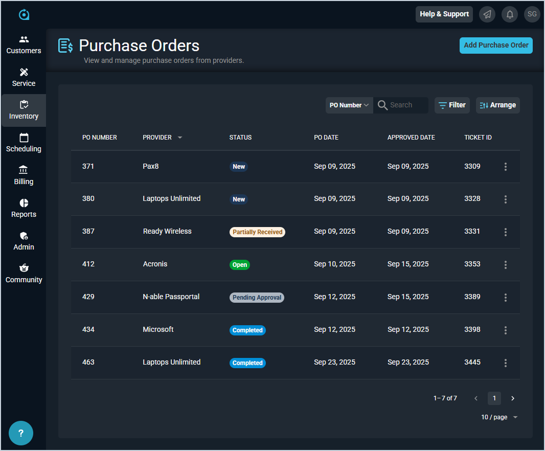 - Create a new purchase order by clicking the Add Purchase Order button. See the Create/Edit Purchase Orders article for more information.