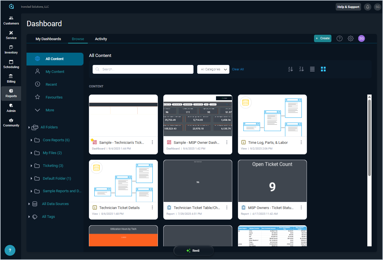 Any content that exists on your Dashboard screen, including both reports and dashboards, displays on the Browse tab, including items that Rev.io created for your convenience and any items you may have created for your company's use.
