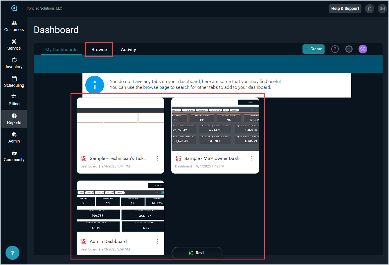 The system does not automatically select a dashboard for you. If you have not yet selected a dashboard to view, the Dashboards screen displays a few dashboard options to get you started. While this screen may seem confusing at first, you simply need to choose one of the available dashboards or click the Browse tab at the top to view more options.