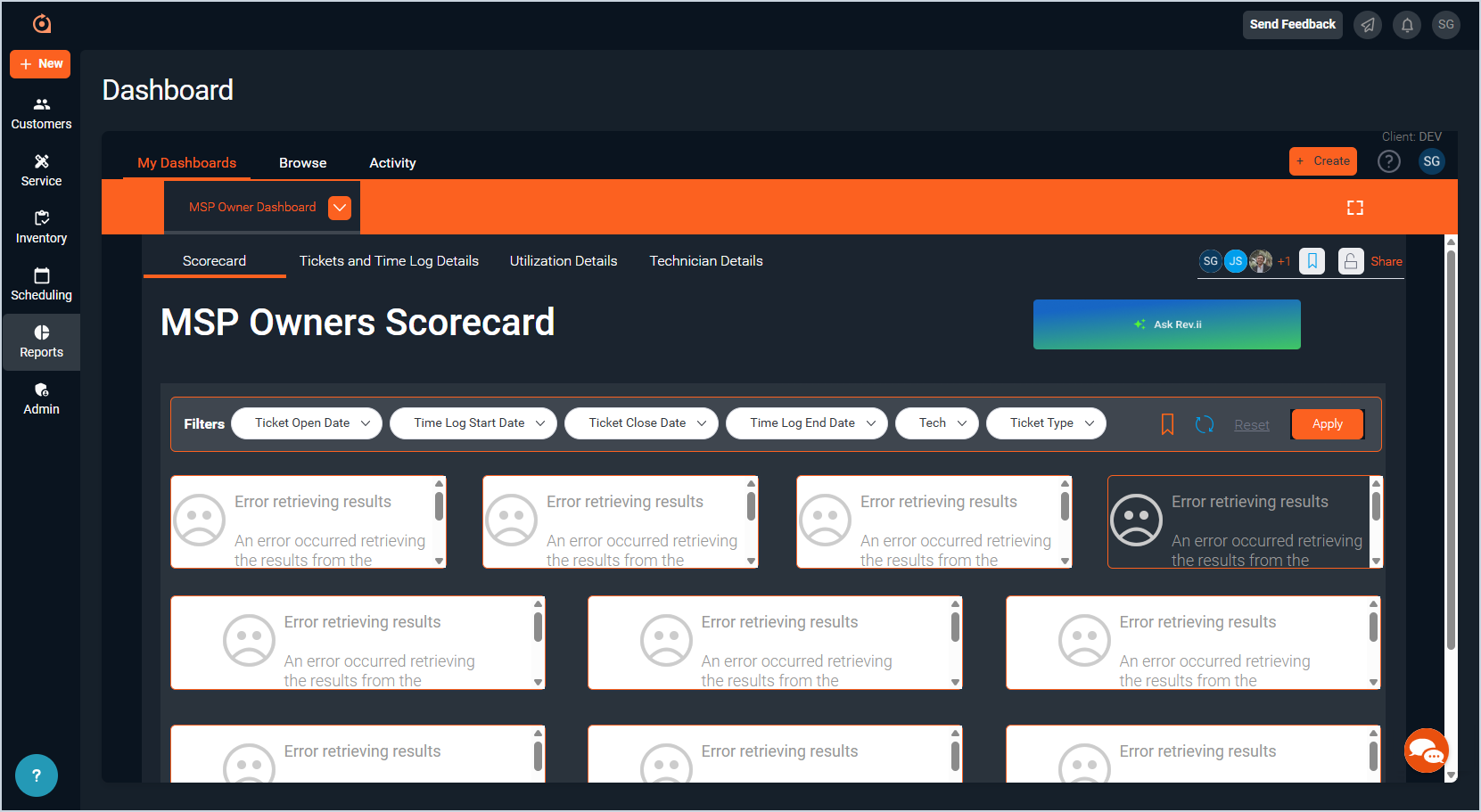 See the screenshots below to troubleshoot your issue with the Reports Dashboard. If you are unable to resolve your issue, or it's not listed below, contact Rev.io Support for assistance.