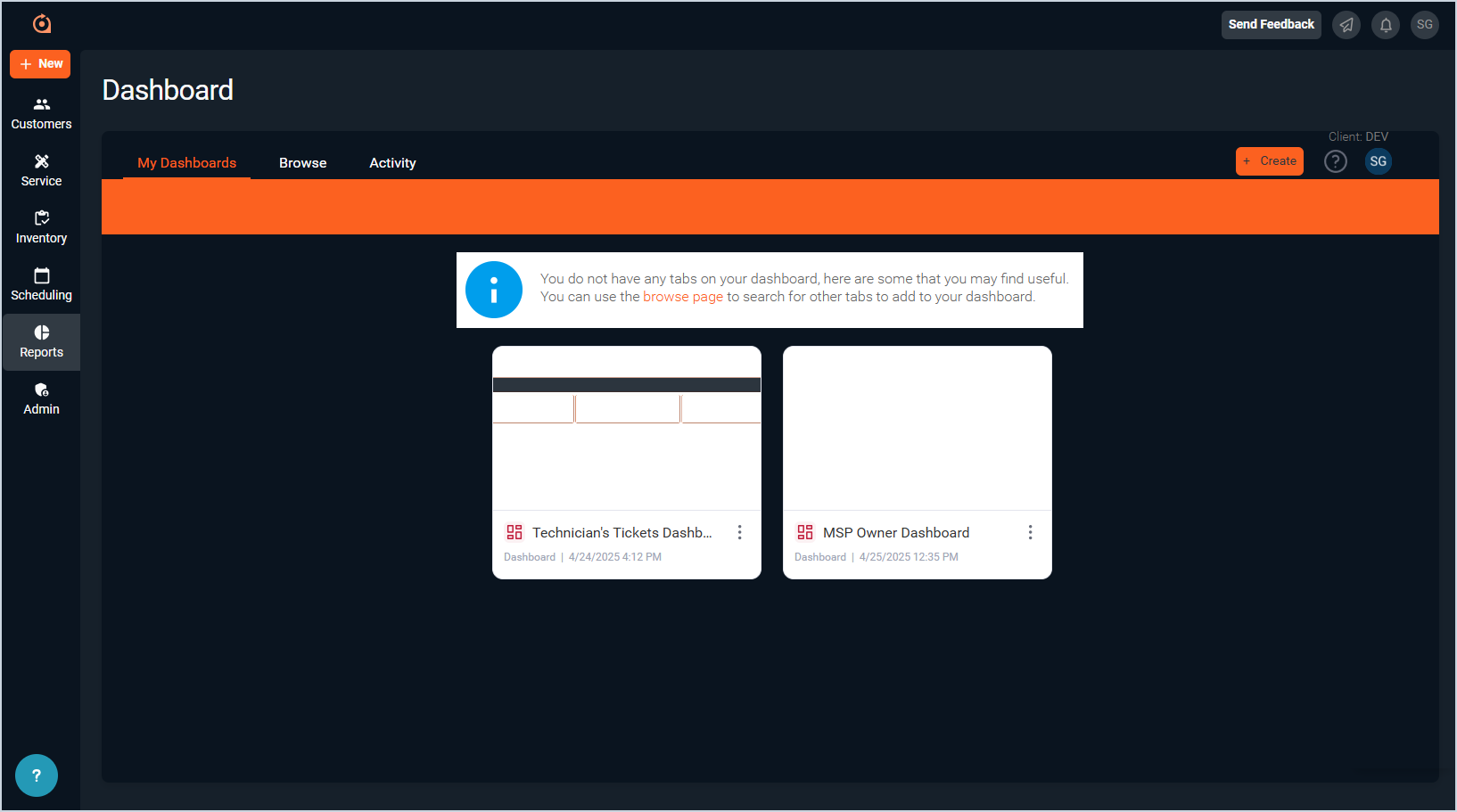 While this screen may seem like an error at first, it simply means that you haven't opened a dashboard yet or you've removed all of your dashboards from your favorites. See the Reports Dashboard: Getting Started article for more information about accessing your first dashboard or the Reports Dashboard: My Dashboards article for more information on adding a dashboard to your favorites.