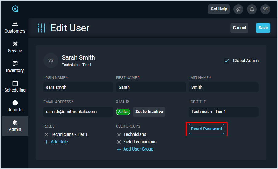 Users with administrator permissions can initiate a password reset for a user in the system by accessing the user's profile and clicking the Reset Password button. That user will receive a password reset email where they can enter a new password.