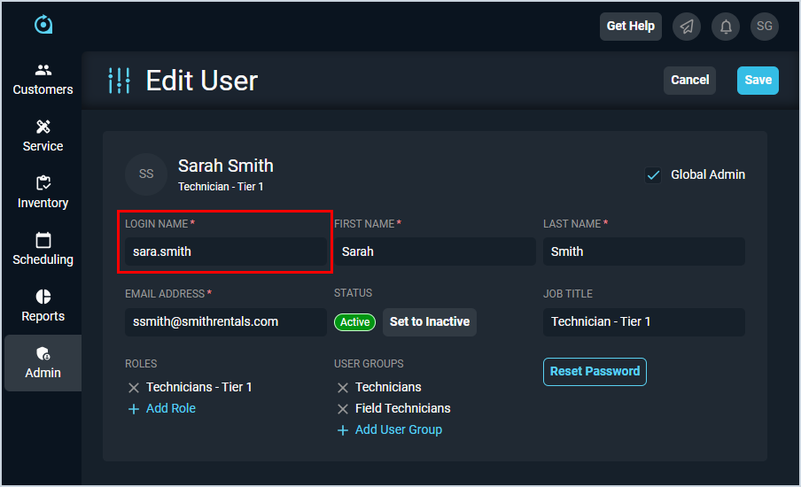 Users with administrator permissions can also update a user's login name by accessing the user's profile and updating the information in the Login Name field.