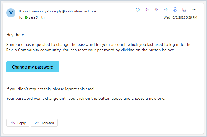 - The password reset email will come from Rev.io Community<no-reply@notification.circle.so> and will include a link to reset your password. From the email, click the Change my Password button. You will be redirected to the Rev.io Community to set a new password.