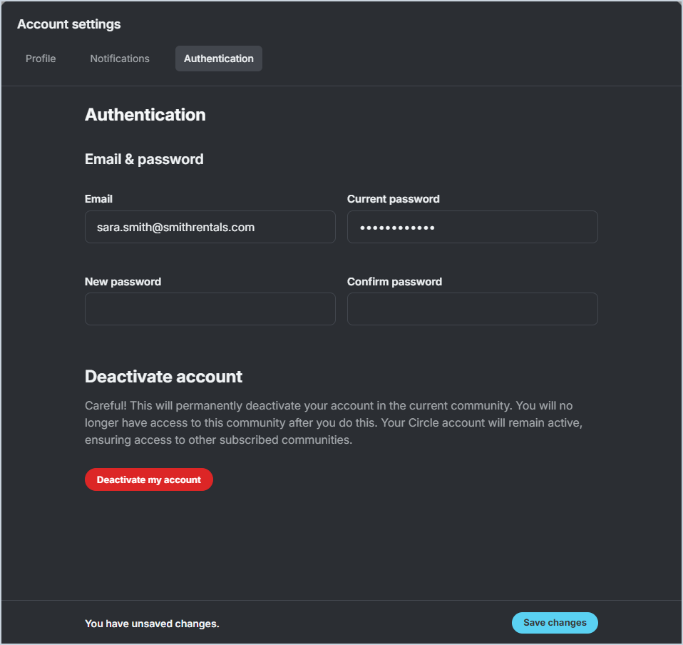 To reset your Rev.io Community password while you are logged into the application, click your profile icon in the top right corner of the screen and select Authentication from the list. Here, you can update your email address or create a new password by entering it in the New Password field and confirming it in the Confirm Password field.