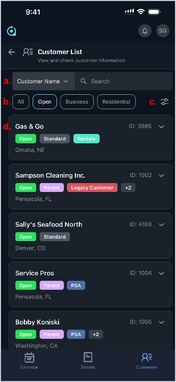 - Tap All, Open, Business or Residential to filter the customers displayed.