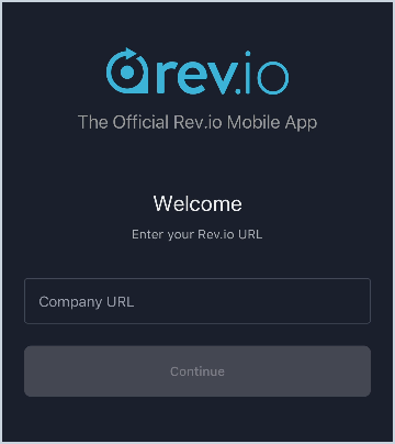 - Enter the URL where you access Rev.io in your browser and click Continue. You will only need to complete this step the first time you log in unless you clear the cache or uninstall the app.