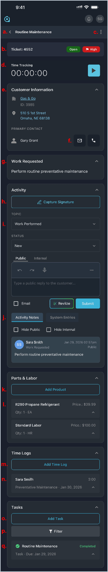 The Ticket Details screen in the Rev.io Mobile app allows you to manage all activity, parts & labor, time logs, and tasks for a ticket. At this time, custom fields created for tickets do not display in the Rev.io Mobile app.