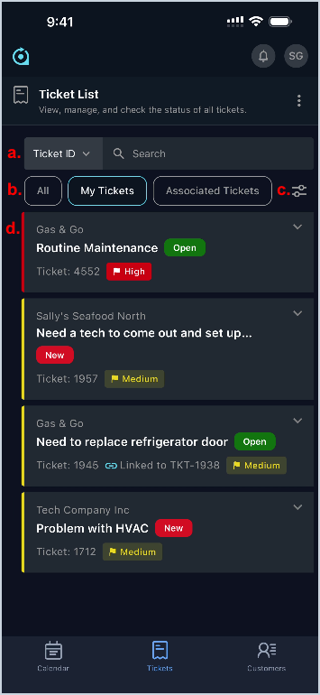 - Tap All, My Tickets, or Associated Tickets to filter the tickets displayed.