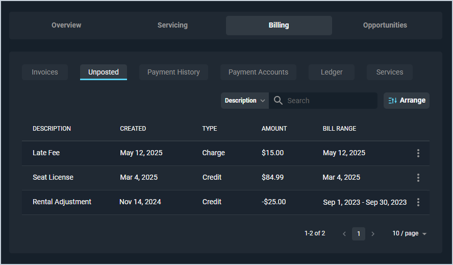 The charges sent from PSA display on the Unposted and Ledger tabs in the Billing & Collections section on the customer profile for further processing. Any charges created but not yet sent to the customer on a bill can be seen on the Unposted tab.