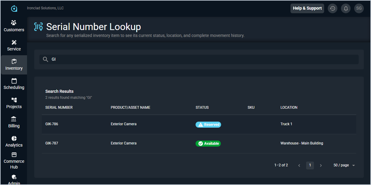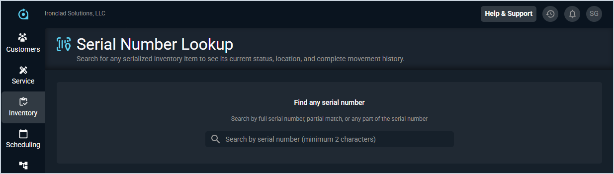- Search for a serialized item by entering a full or partial serial number in the search bar. A minimum of 2 characters is required, and results update in real time as you type.