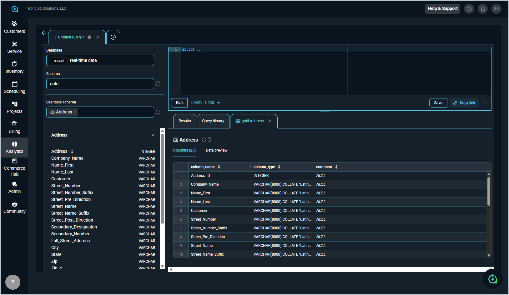 Clicking SQL Lab in the Analytics module opens the query editor, where you can write and run T-SQL queries directly against your Rev.io data. SQL Lab is divided into three main areas.