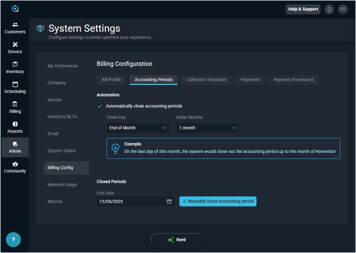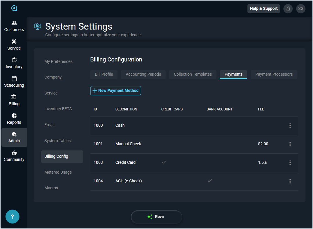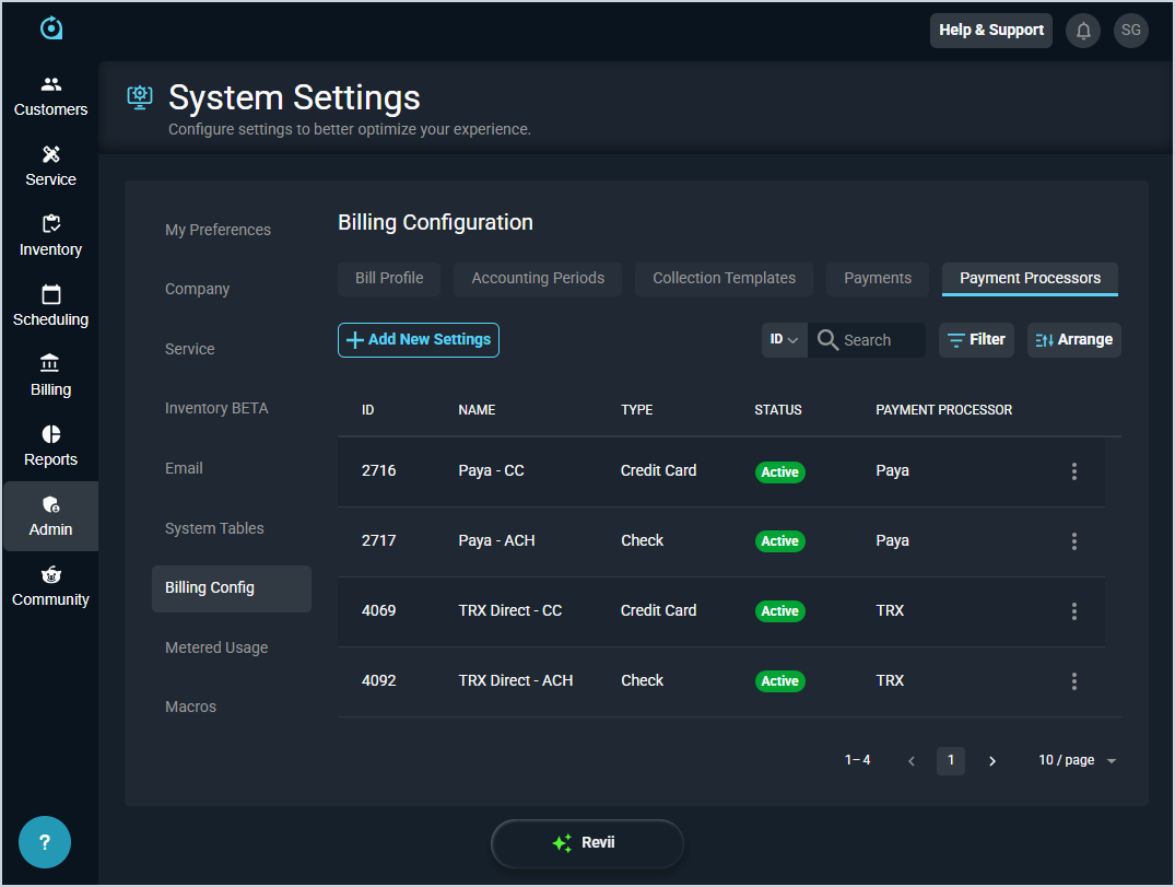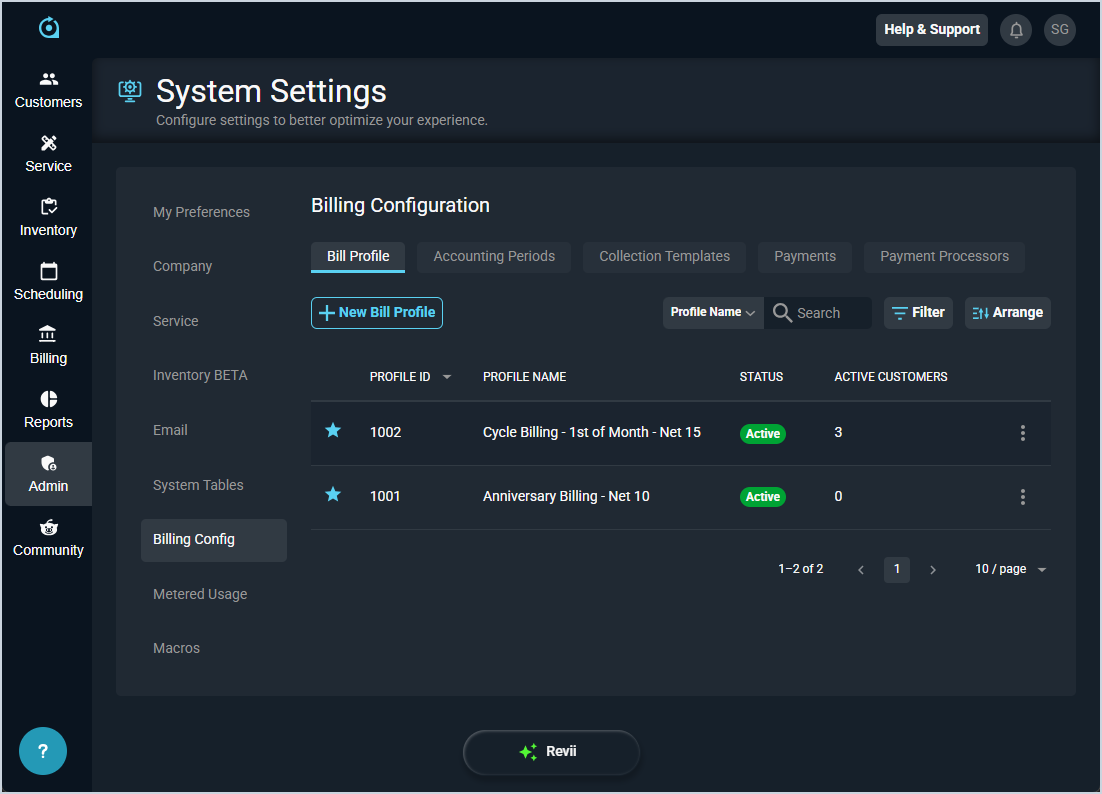 The Billing Config category on the System Settings screen allows you to configure various billing settings for your Rev.io instance, including bill profiles, collection templates, payments, and processors. The functionality available in the Billing Config category is derived from our legacy Billing platform.