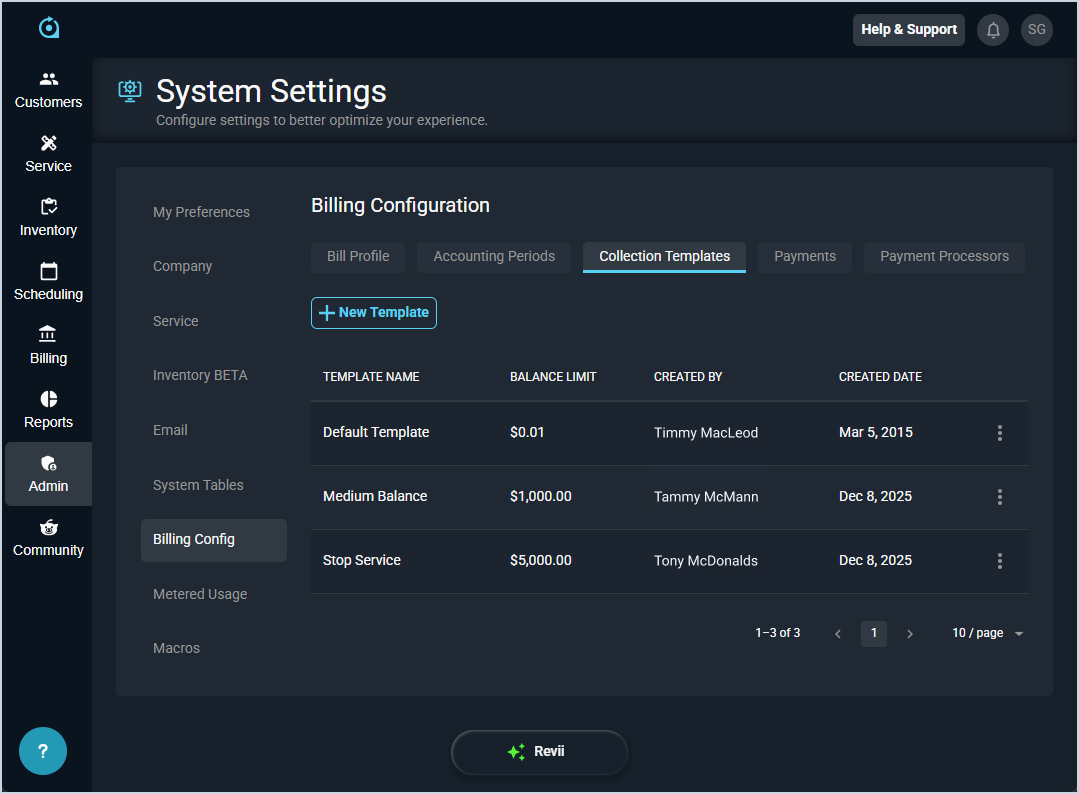 The Collection Templates section allows you to build out templates with various collections steps that you can assign to bill profiles in Rev.io.