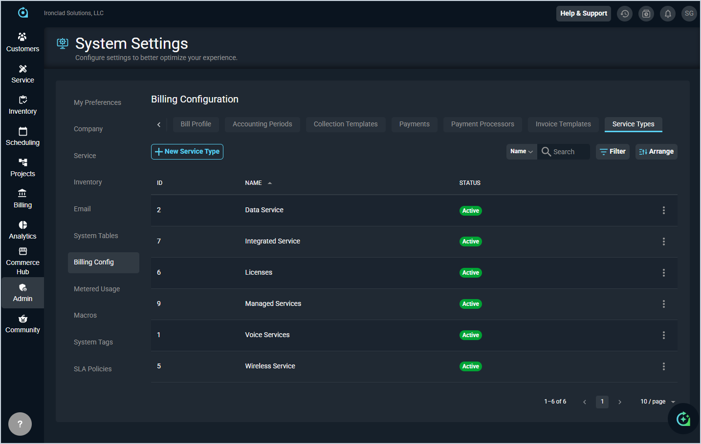 The Service Types section allows you to define the categories used to classify services on customer accounts and quotes. Service types are referenced when adding a service to a quote, helping to identify the nature of the offering being provided.
