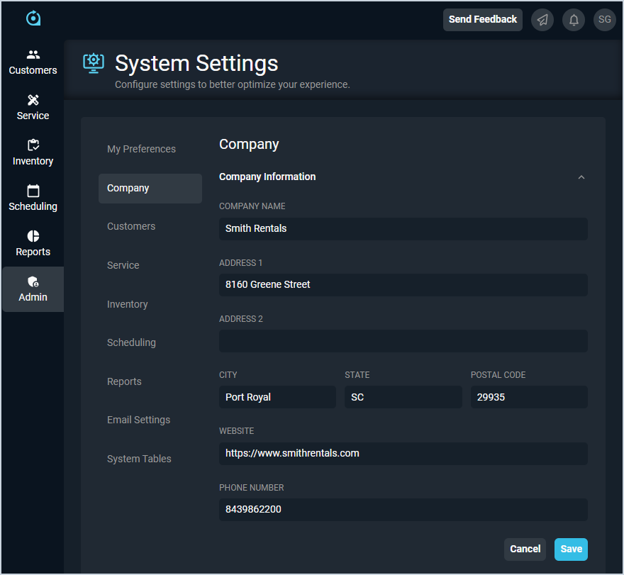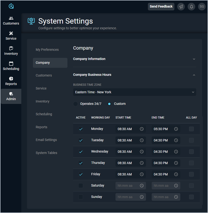The Company category on the System Settings screen allows you to enter general information for your company, including name, address, contact information, and business hours. Once this category has been completed, you likely won't need to make any changes to this screen unless you have a major change to your business.