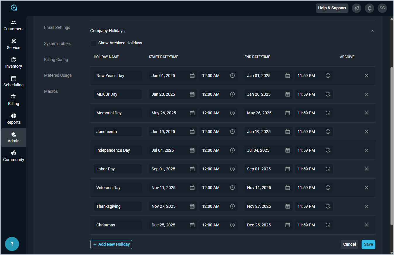- Enter or edit your company holidays using the fields in the Company Holidays section and clicking the Save button.