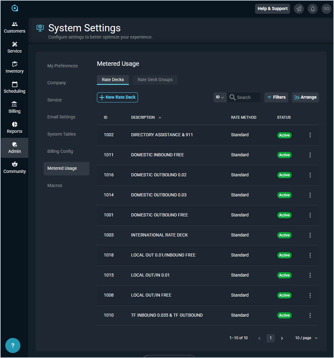 The Metered Usage category on the System Settings screen allows you to import rate decks from your providers and configure rate deck groups to ensure accurate customer billing. Rate decks define telecom pricing by listing rates for call destinations, prefixes, or usage types, including details such as cost per minute and billing increments. Rate deck groups organize multiple rate decks under a shared structure, making it easier to apply consistent billing rules, assign decks to customers or services, and manage rate updates across regions or carriers.
