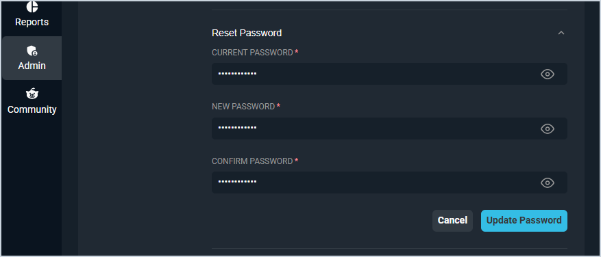 | 2 | New Password | To reset your password, enter the new password you want to use. NOTE: Passwords must contain at least 1 lowercase letter, 1 uppercase letter, 1 number, 1 special character, and a minimum of 12 characters. |
