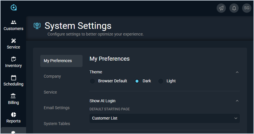 The System Settings screen allows you to configure various settings to better optimize your Rev.io PSA experience, including your dark/light mode preference, desired starting page, and default language.