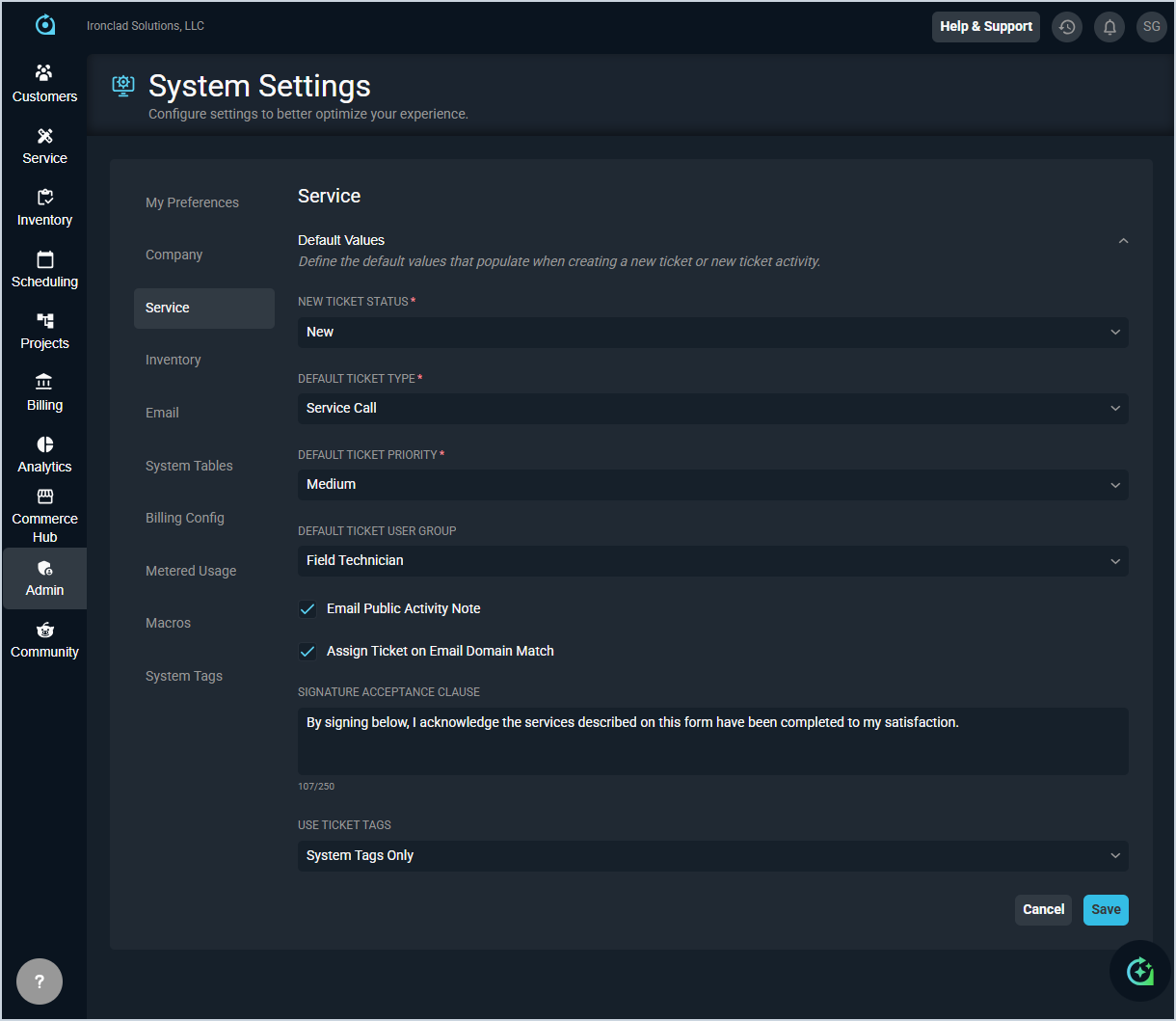The Service category on the System Settings screen allows you to enter settings for tickets created in your instance, including default status, type, priority, and rep group. When creating new tickets, the options set here will be pre-selected, but can always be changed on individual tickets as needed.