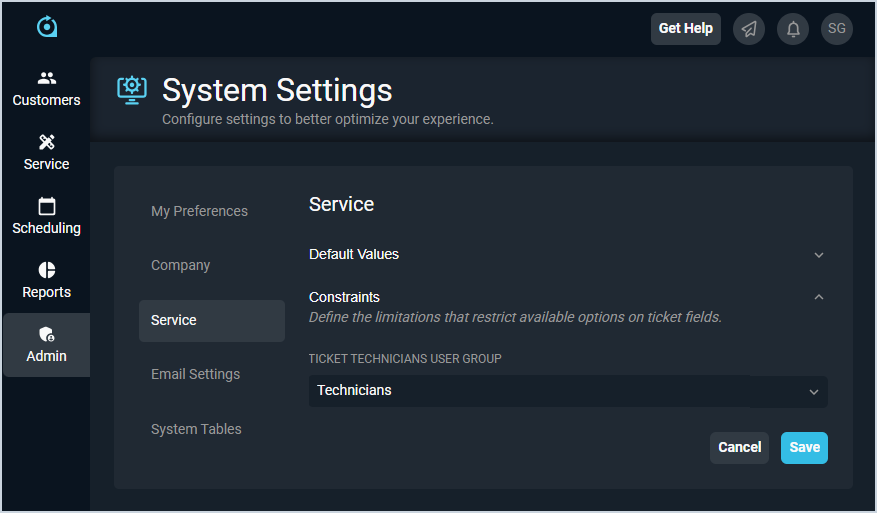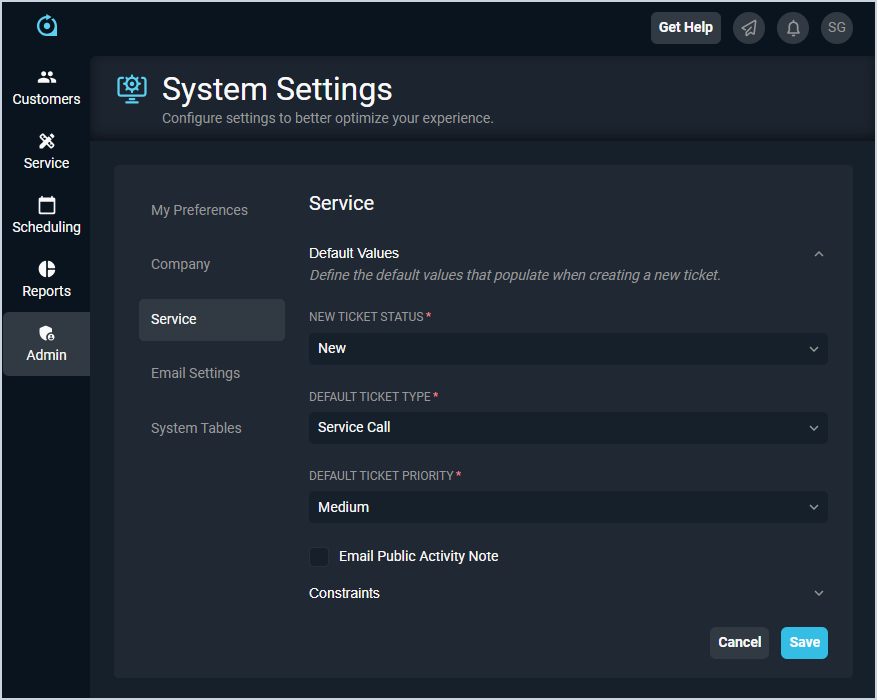The Service category on the System Settings screen allows you to enter settings for tickets created in your instance, including default status, type, priority, and rep group. Once this category has been completed, you likely won't need to make any changes to this screen unless you have a major change to your business.