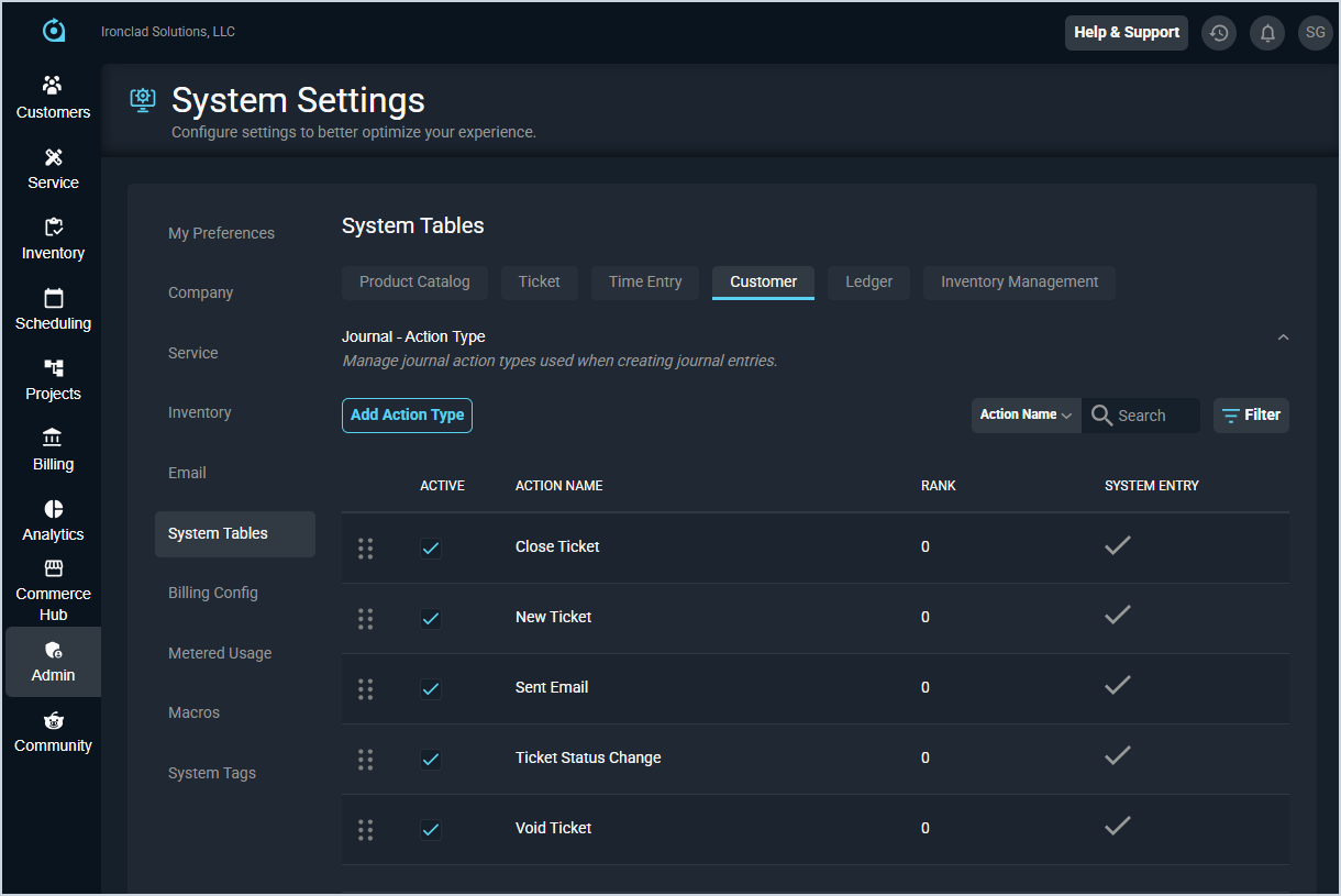 The Journal - Action Type section allows you to manage the action types available when creating journal entries on customer profiles.