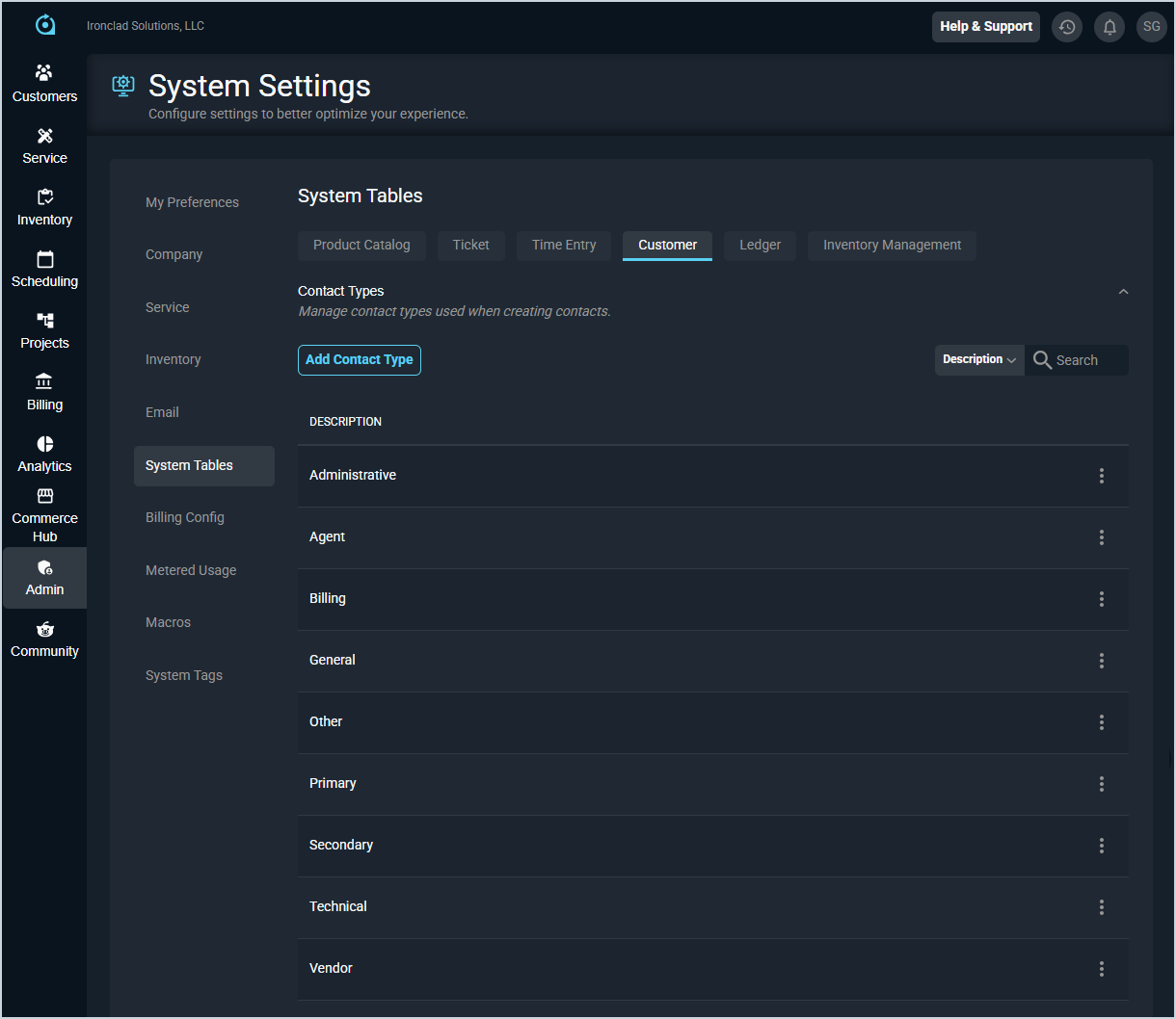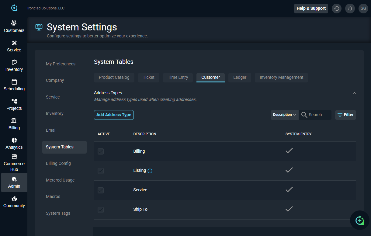 The Customer tab in the System Tables category on the System Settings screen allows you to configure the values available in various dropdowns related to customers throughout the system, including journal action types, contact types, and address types.