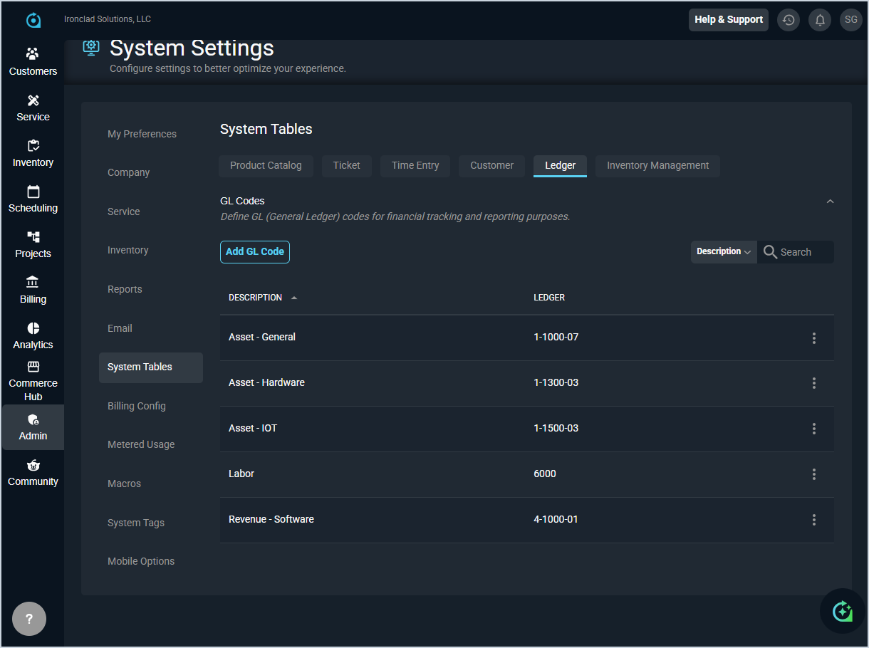 The Ledger tab in the System Tables category on the System Settings screen allows you to define the GL (General Ledger) codes used for financial tracking and reporting purposes. These codes can be assigned to products in your catalog to support accounting and reporting workflows.