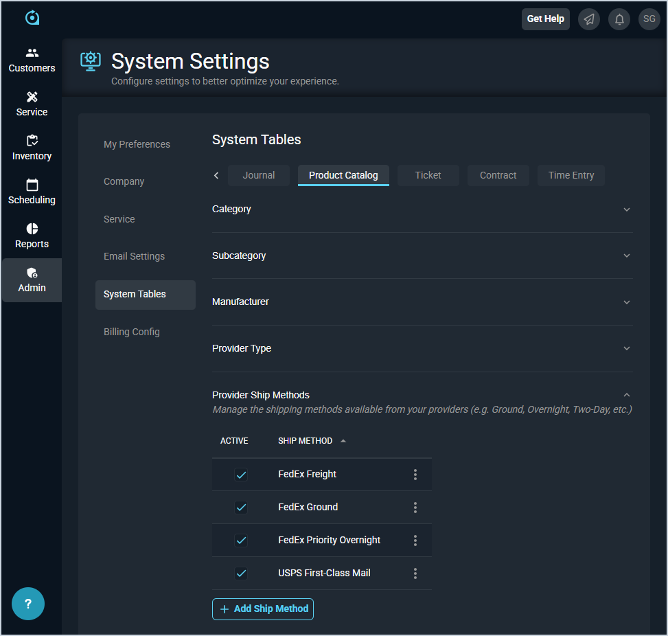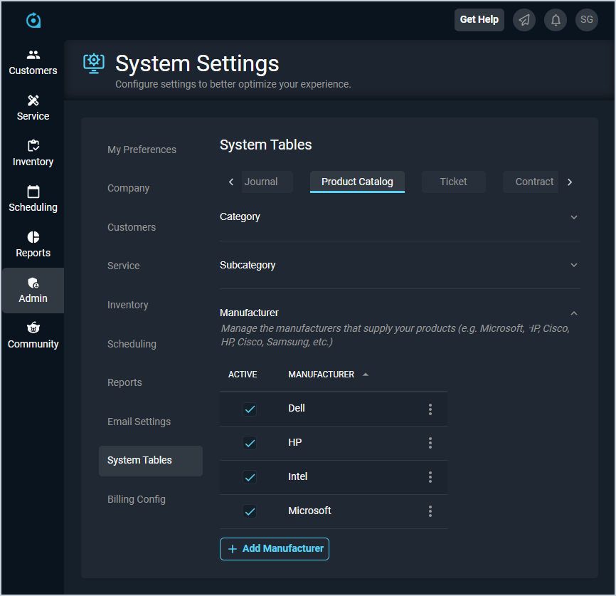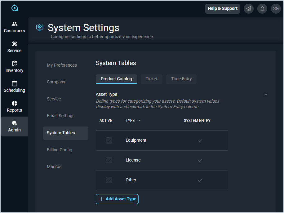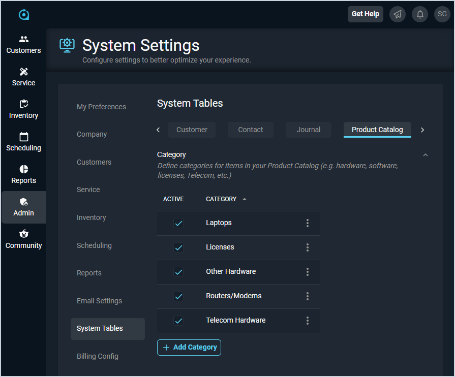 The System Tables category on the System Settings screen allows you to configure various data points that can be selected using dropdown menus throughout your database. The Product Catalog tab specifically controls the values available in various dropdowns related to your product catalog throughout the system.