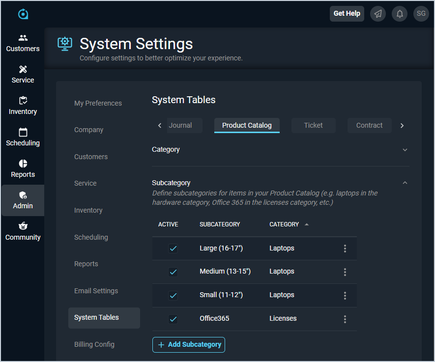 | 1 | Active | A checkmark indicates that the subcategory is active in your instance. |