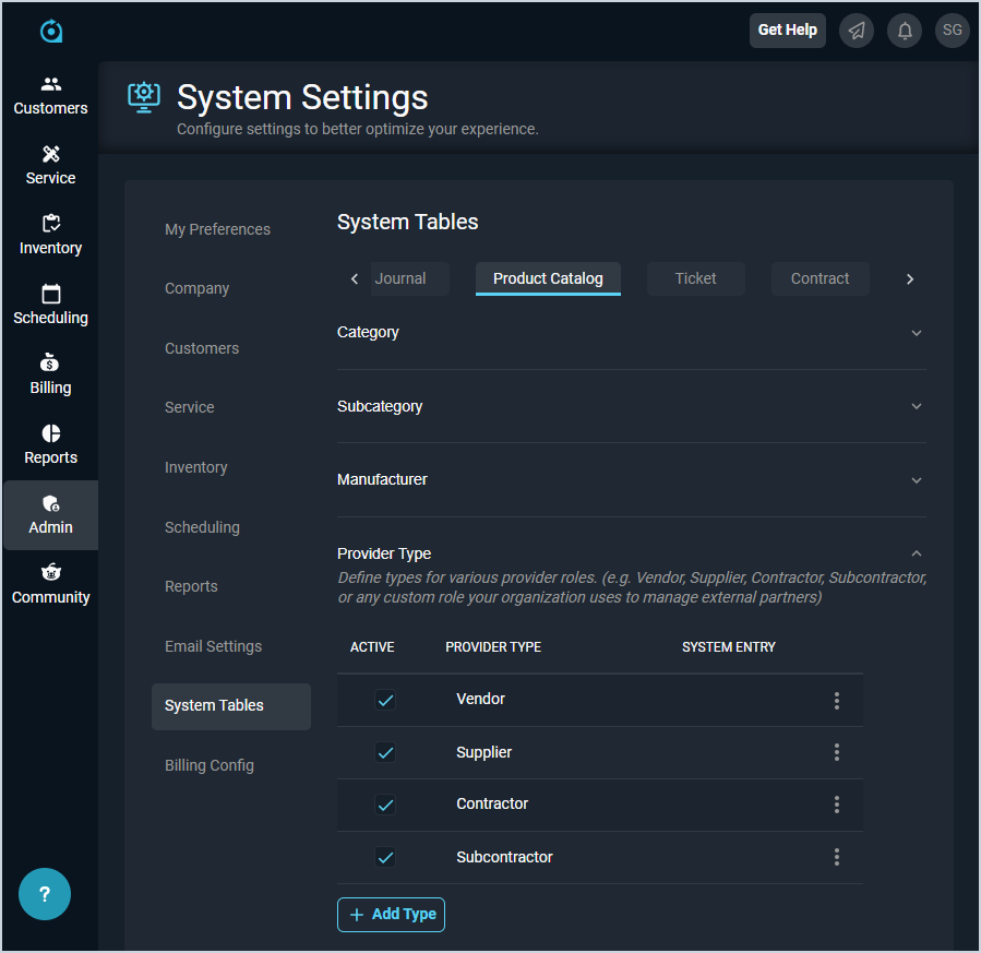| 1 | Active | A checkmark indicates that the provider type is active in your instance. |