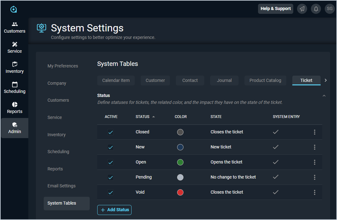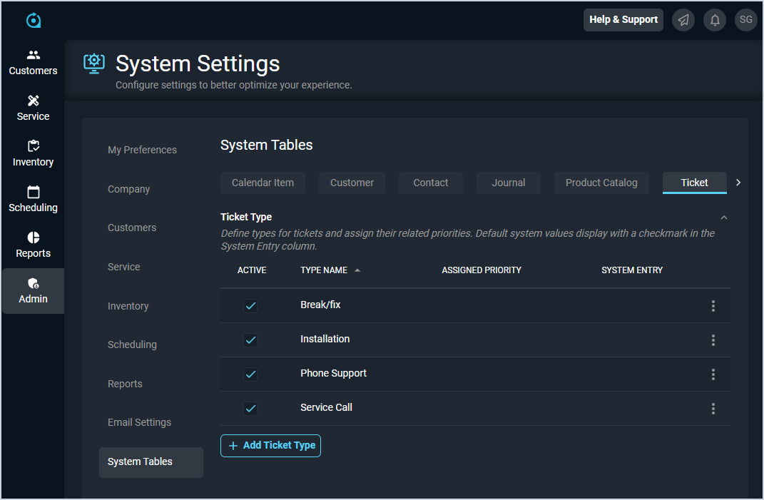 The System Tables category on the System Settings screen allows you to configure various data points that can be selected using dropdown menus throughout your database. The Ticket tab specifically controls the values available in various dropdowns related to tickets throughout the system.