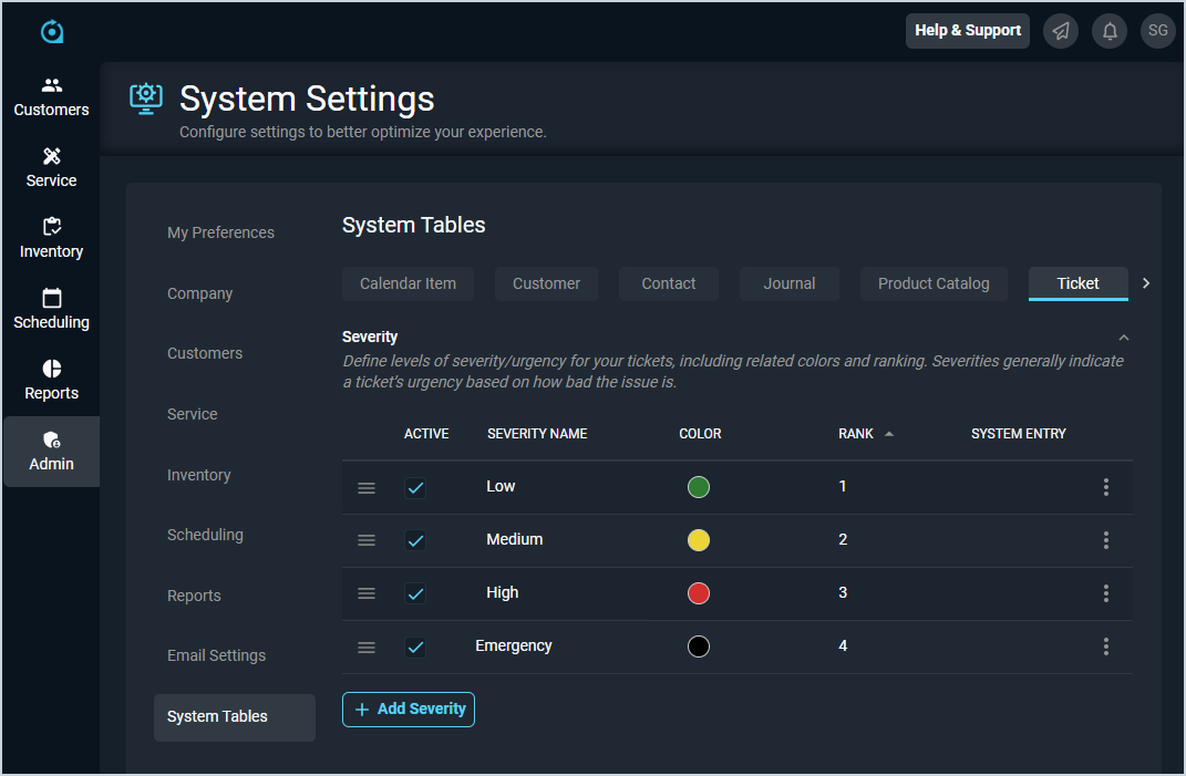 | 4 | Rank | Order the severity option displays in when using the Severity dropdown on tickets. NOTE: To reorder the line items, simply click and drag the items into the desired order using the drag icon at the start of the row. |