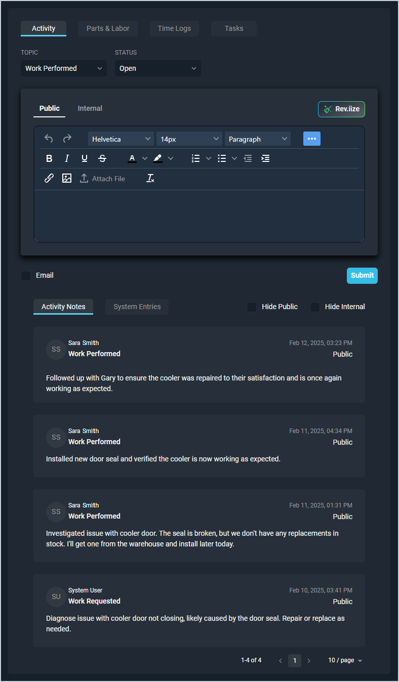 The Activity tab on the Ticket Details screen is the log of interactions and updates on your customers' tickets. This tab allows you to enter new activity notes and displays a brief overview of existing notes on the ticket. These notes can be entered directly in Rev.io PSA on the Activity tab by your technicians, received via email to the monitored address configured in Email Settings, or submitted by your customers in the Customer Portal.