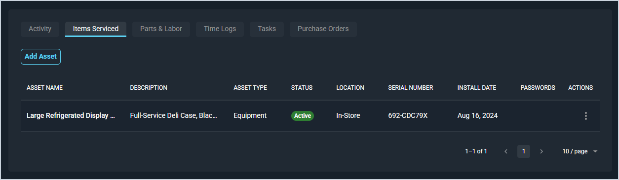 The Items Serviced tab on the Ticket Details screen contains a list of the customer's assets being serviced on the ticket. 'Assets' in Rev.io are items the customer owns or leases that you service or monitor. These items can include physical equipment, like PCs, laptops, and monitors; digital licenses, like Office 365, Pax8, and Acronis; and telecom assets, like telephone numbers and SIM cards. You can also add and remove assets on the ticket directly from the tab without being directed to another screen.