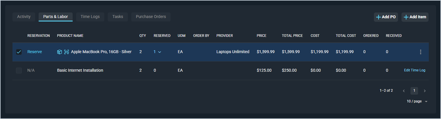 | You cannot edit or delete part/labor items created automatically from billable time logs. Editing/deleting a billable time log also edits/deletes the associated line item on the Parts & Labor tab. See the Create/Edit Time Logs article or Deleting Time Logs article for more information. |