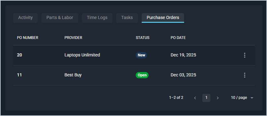 The Purchase Orders tab on the Ticket Details screen contains a list of all purchase orders associated with that ticket in a single view. From this tab, you can review and edit linked purchase orders, making it easy to manage ordering activity related to the ticket without leaving the ticket record.