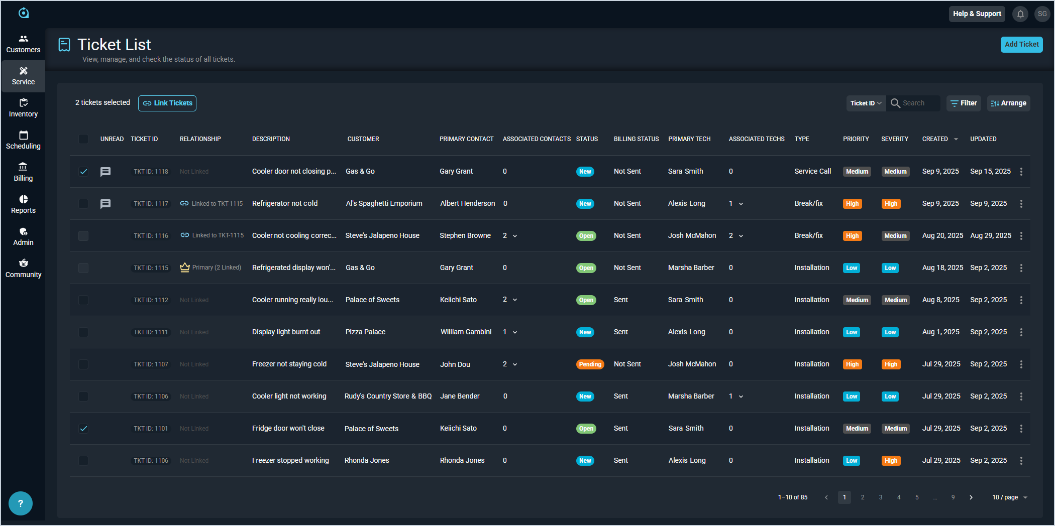 - Create a linked relationship for two or more tickets by clicking the checkbox at the start of each row and clicking the Link Tickets button above the grid. See the Linking Related Tickets article for more information about ticket relationships. NOTE: Linking or unlinking tickets automatically adds a note to the System Entries section on each ticket's Activity tab.