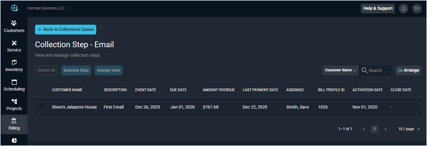 The Collection Step Details screen lets you drill into a specific collection step from the Collections list view to see the customers currently in queue that require action. From this screen, you can process the step directly or assign it to one or more users, making it easy to manage responsibility and keep collections moving forward.