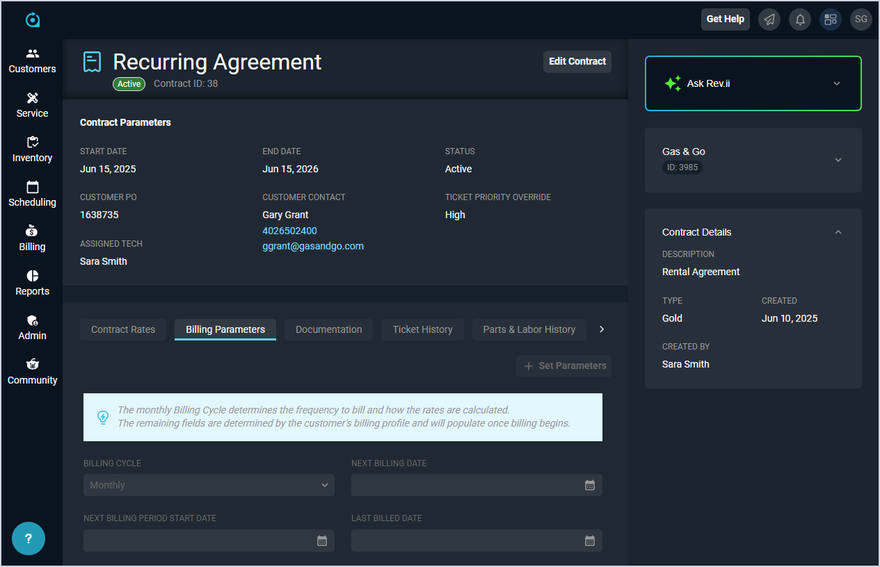 The Contract Details screen allows you to view all relevant details for individual contracts and access several tabs to manage those contracts, including adding covered rate items and defining any terms, conditions, or comments. A 'contract' is an agreement to provide a specific level of service and support to your customer in exchange for a fee. Contracts in Rev.io PSA track both revenue and historical information, including tickets, parts and labor, and time logged.