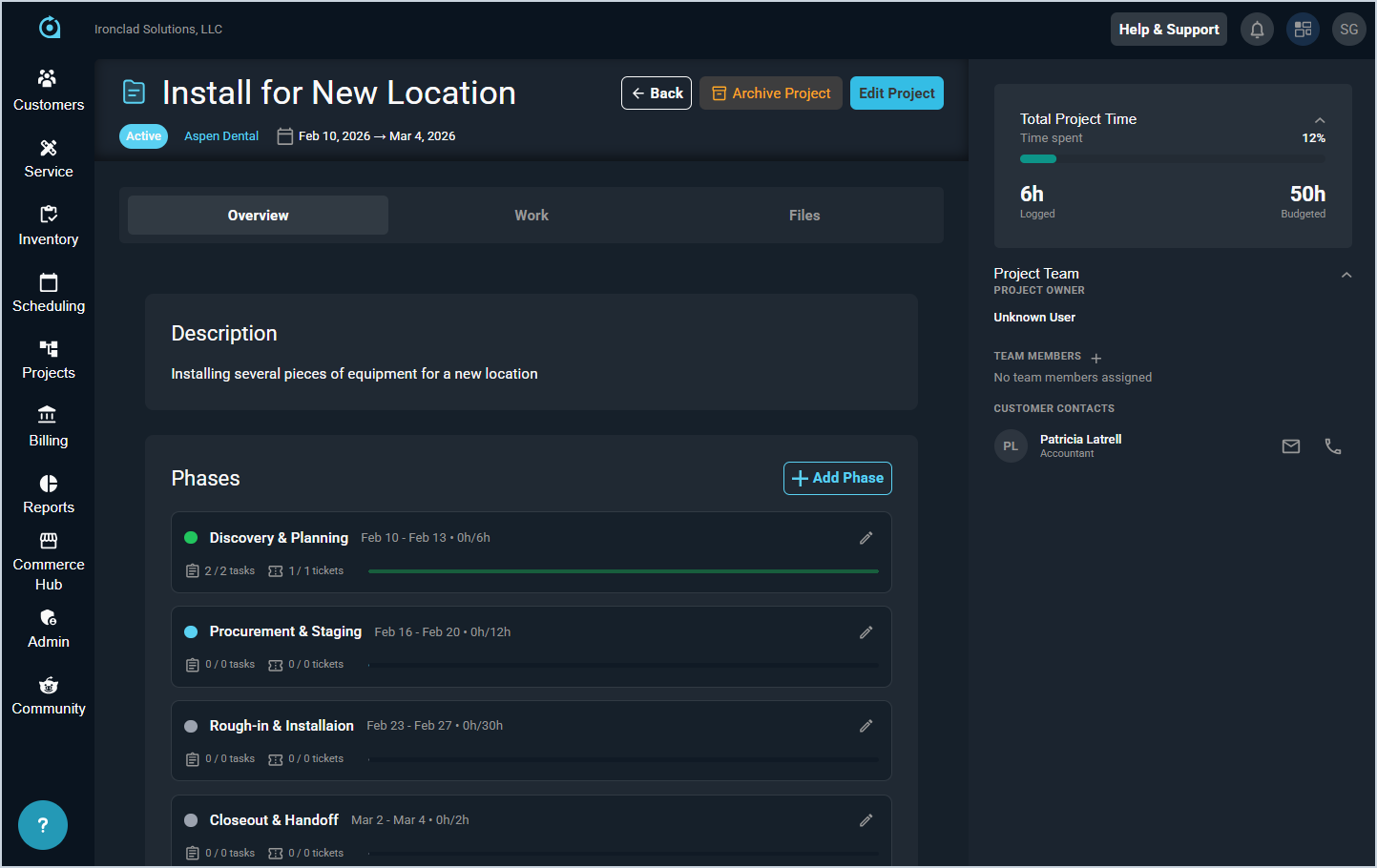 The Project Details screen allows you to view all relevant details for individual projects, including its phases, tickets, tasks, and linked quote(s) across three different tabs and various sections.