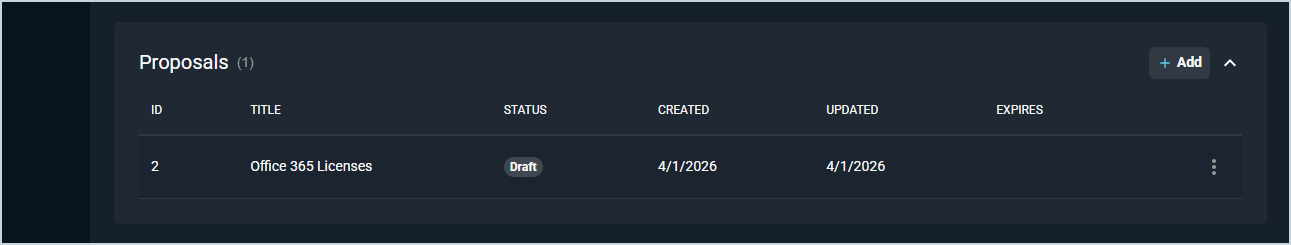 The Proposals section displays all signable proposal documents associated with the quote. Click the + Add button to add a new proposal to the quote. See the Adding Proposals to Quotes article for more information.